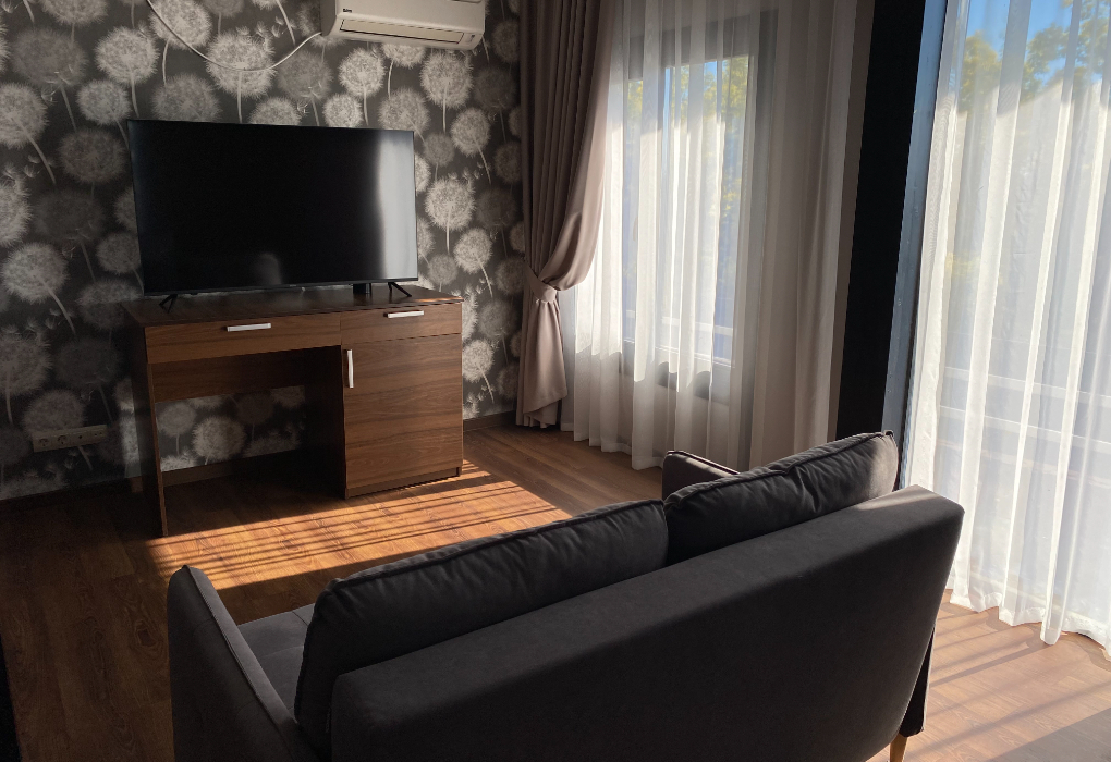 Площадь номера - 60 кв.м. 2 комнаты. 4 осн. места. две 2-спальные кровати. В номере: телевизор; кондиционер; душ; туалет; фен; мини-холодильник; чайная станция. 1 доп. место: