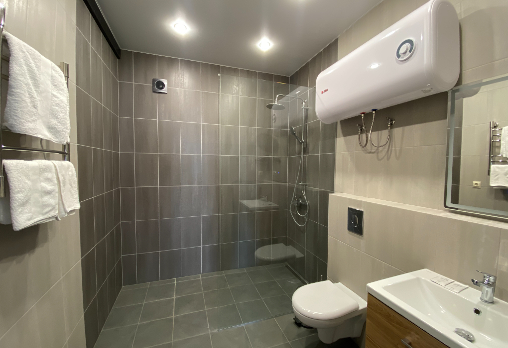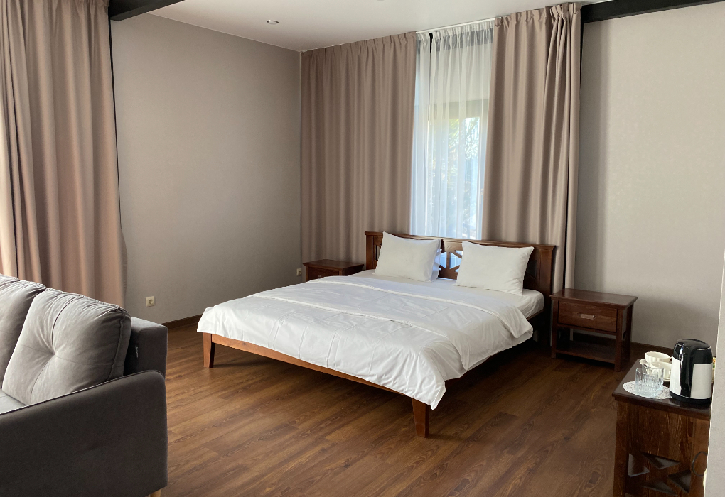 Площадь номера - 60 кв.м. 2 комнаты. 4 осн. места. две 2-спальные кровати. В номере: телевизор; кондиционер; душ; туалет; фен; мини-холодильник; чайная станция. 1 доп. место: